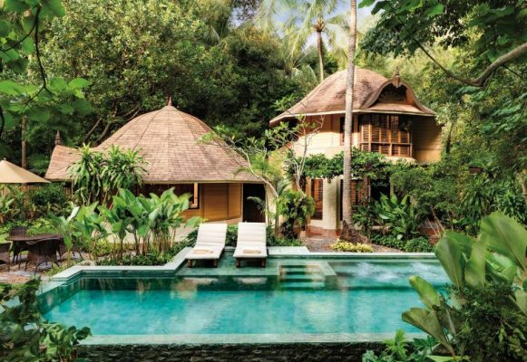 Phong cách Bali: resort hoà mình với thiên nhiên, hồ bơi tràn bờ, ánh sáng tự nhiên.